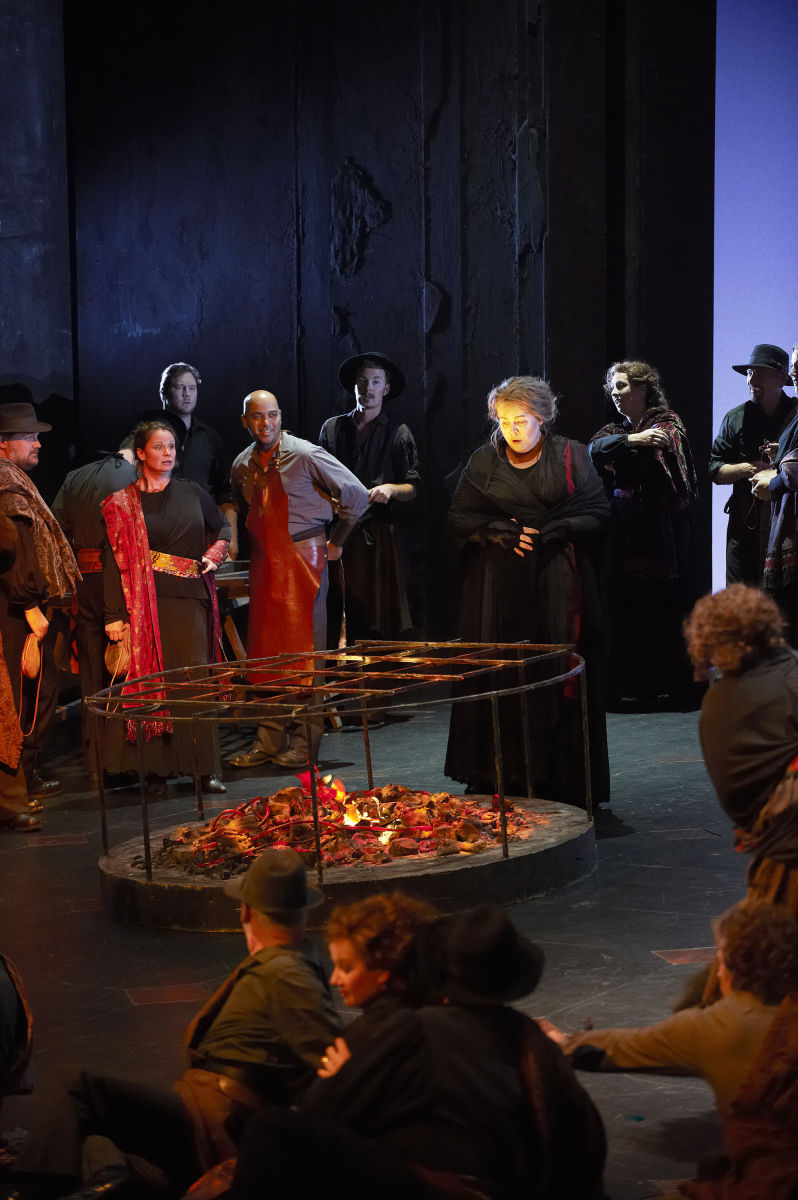 12-13-01-MC-D-0207 â Elena Manistina (centre) as Azucena in the Canadian Opera Companyâs production of Il Trovatore, 2012. Conductor Marco Guidarini, director Charles Roubaud, set designer Jean-Noël Lavesvre, costume designer Katia Duflot and lighting designer Marc Delamézière. Photo: Michael Cooper