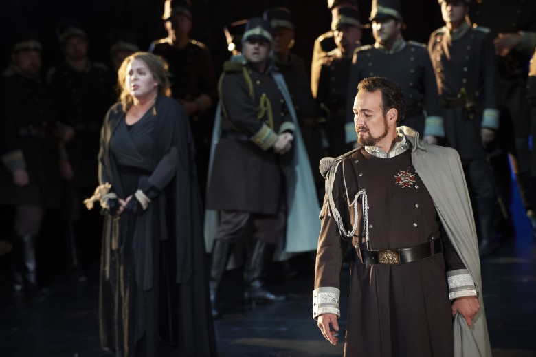 12-13-01-MC-D-0738 – (l – r) Elena Manistina as Azucena, Dmitry Belosselskiy as Ferrando and Russell Braun as Conte di Luna in the Canadian Opera Company’s production of Il Trovatore, 2012. Conductor Marco Guidarini, director Charles Roubaud, set designer Jean-Noël Lavesvre, costume designer Katia Duflot and lighting designer Marc Delamézière.